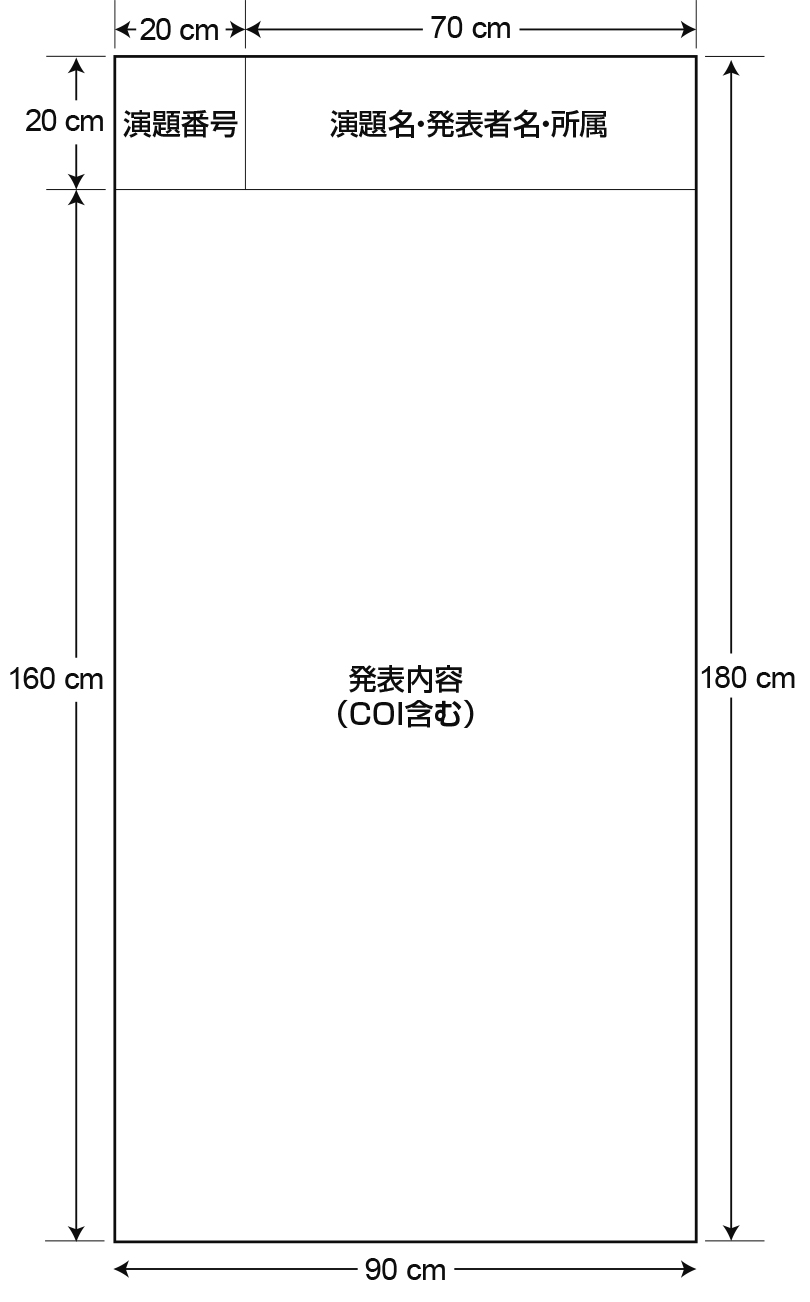 演題番号(20×20 cm)については主催者側で用意いたします。演題名と発表者氏名 ・所属の表題を次ページの図に従ってご準備ください。 - 3. ポスターは英語で作成してください。演題を和文と英文で登録された場合は、「演題名 ・ 発表者氏名・所属」は和名と英名を併記してください。